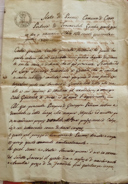 legale documento anche melio, si dichiara che il qui presente Natale di fu Luigi Scarenzi domiciliato a Gombio, che a venduto e vende a libera vendita, una porzione di uno fondo castagnativo posto nel territorio di Gombio, loco detto alli Valetti a cui confina, a matina il venditore, a merigio Violi Giovanni, a sera ed al nord l’aquirente. Al qui presente Prospero di Giuseppe Pedroni nativo e domiciliato in detto luogo, che compra stipola ed accetta per se, e con denari propri riccavati sotto la sua professione di calzolaio cosi dichiarando come dichiara in aqui. E questo pel prezzo di lire nove di Parma, trenta e cinque 35. prezo giusto convenuti amichevolmente. La qual soma è stata sborsata prima d’ora in mane del sudetto Scarenzi il quale dice e confessa d’averla anche ritenuta presso di se, facendole fini quietanze in ogni (?) E le predette cose tutte hanno asserito e asserivano le contraenti parti essere vere promettendone la piena osservanza sotto l’obbligo di se stessi beni tutti presenti fatturi (?) Li sopra descritti contraenti non si firmano, che Scarenzi, perché Pedroni e ileterato, pero viene pubblicato alla presenza di me infrascritto e degli sotto scritti testimoni cioè Costi Giuseppe, e Francesco Birzi tutti di Gombio, Scarenzi Natale afermo quanto sopra, Francesco Birzi testimonio Giuseppe Costi testimonio. Angelo Birzi Sindaco al Comune di Ciano, scrissi di comisione delle parte e fui testimonio: segue la registrazione a Langhirano il 16 gennaio 1845 con le tasse pagate